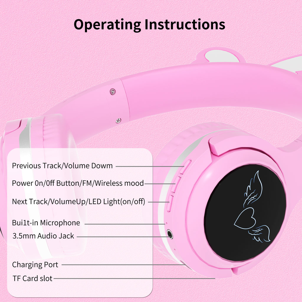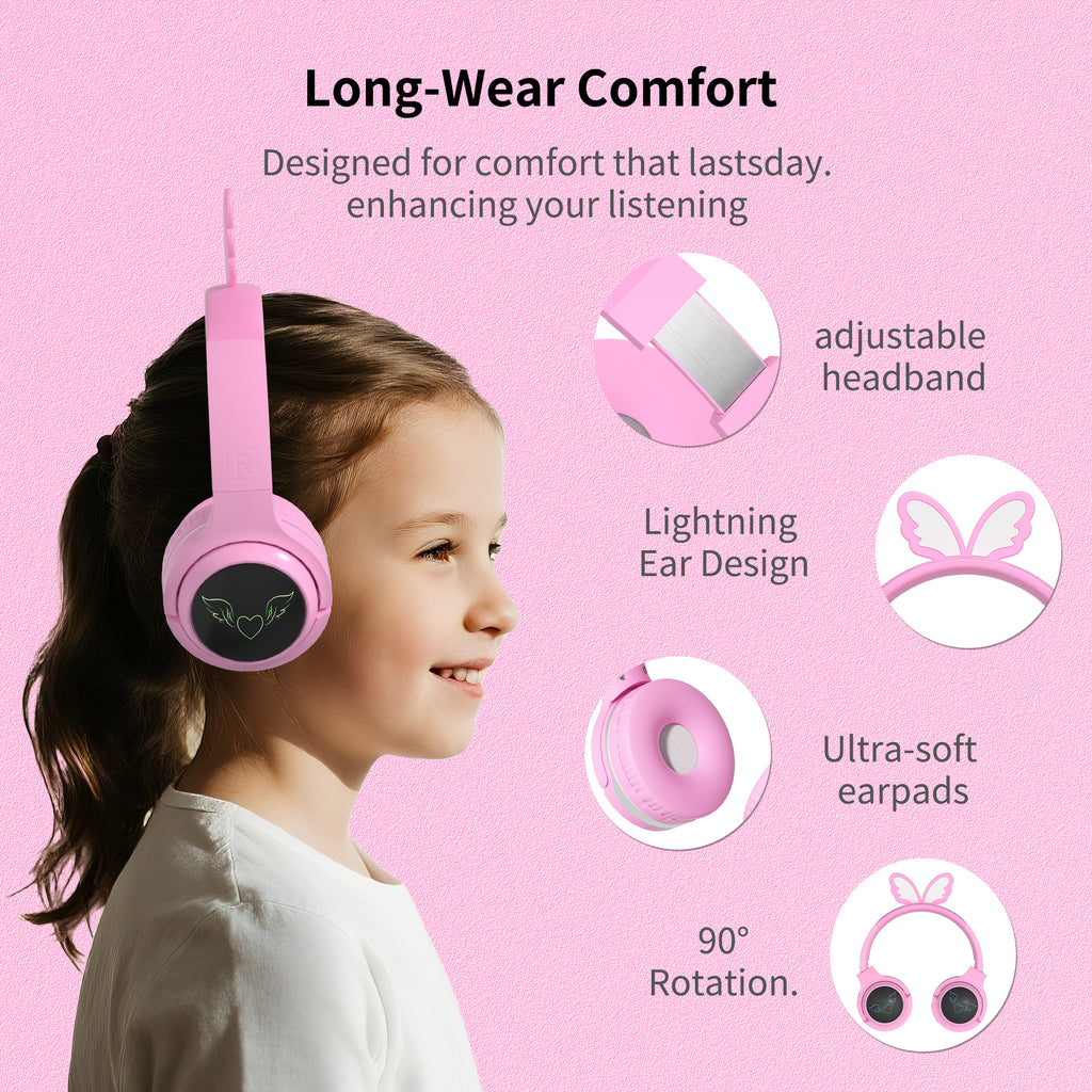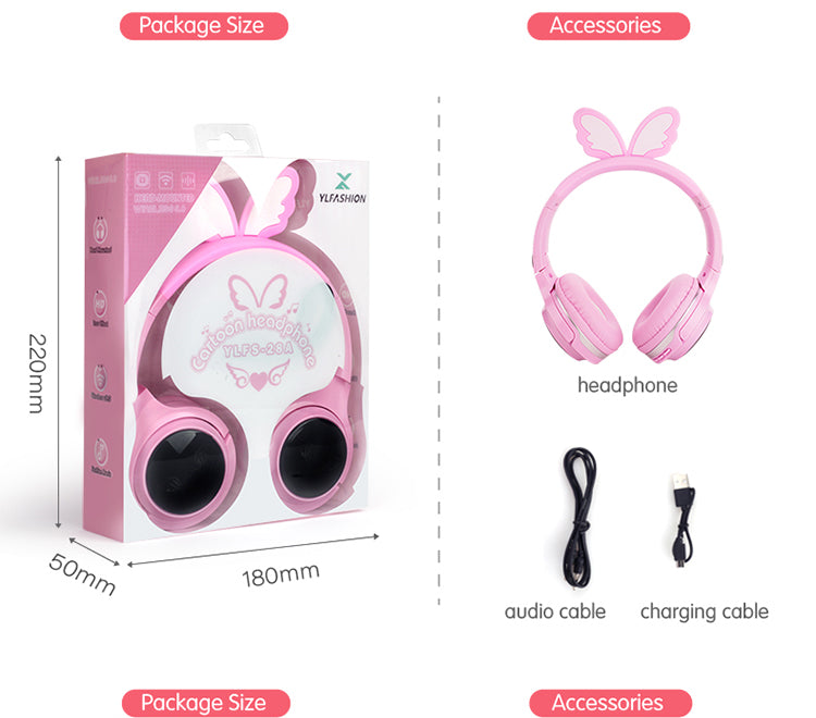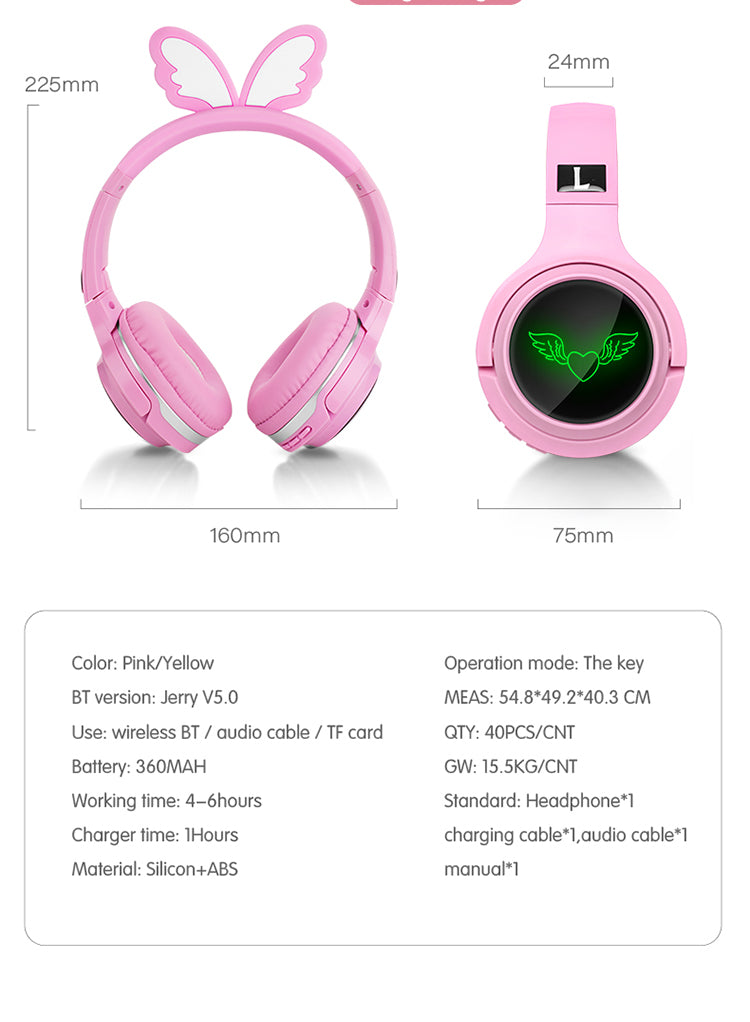 Enchanting Design: Adorned with delicate wing - shaped elements on the headband and a glowing heart - and - wing logo on the earcups, these headphones are available in delightful pink and yellow colors. The soft, cushioned earpads and adjustable headband ensure a comfortable fit for extended use. Measuring 225mm in height, 160mm in width at the earcups, and with a 24mm - thick profile, and an earcup diameter of 75mm, they're designed to look good and feel great.